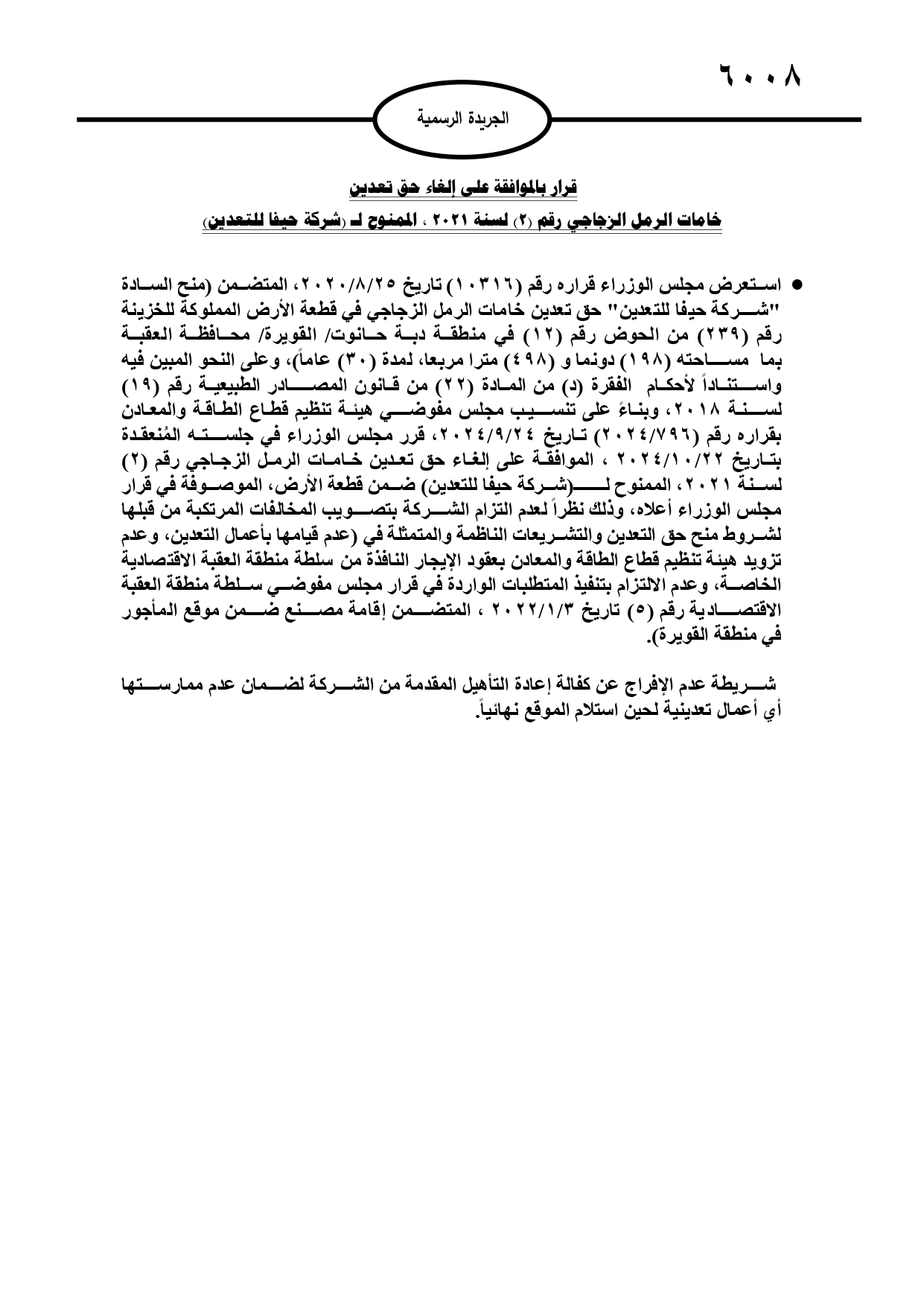 صدر في عدد الجريدة الرسمية، الخميس، قرار الموافقة على إلغاء حق تعدين خامات الرمل الزجاجي رقم (2) لسنة 2021 ، الممنوح لـ(شركة حيفا للتعدين). وتاليا نص القرار: