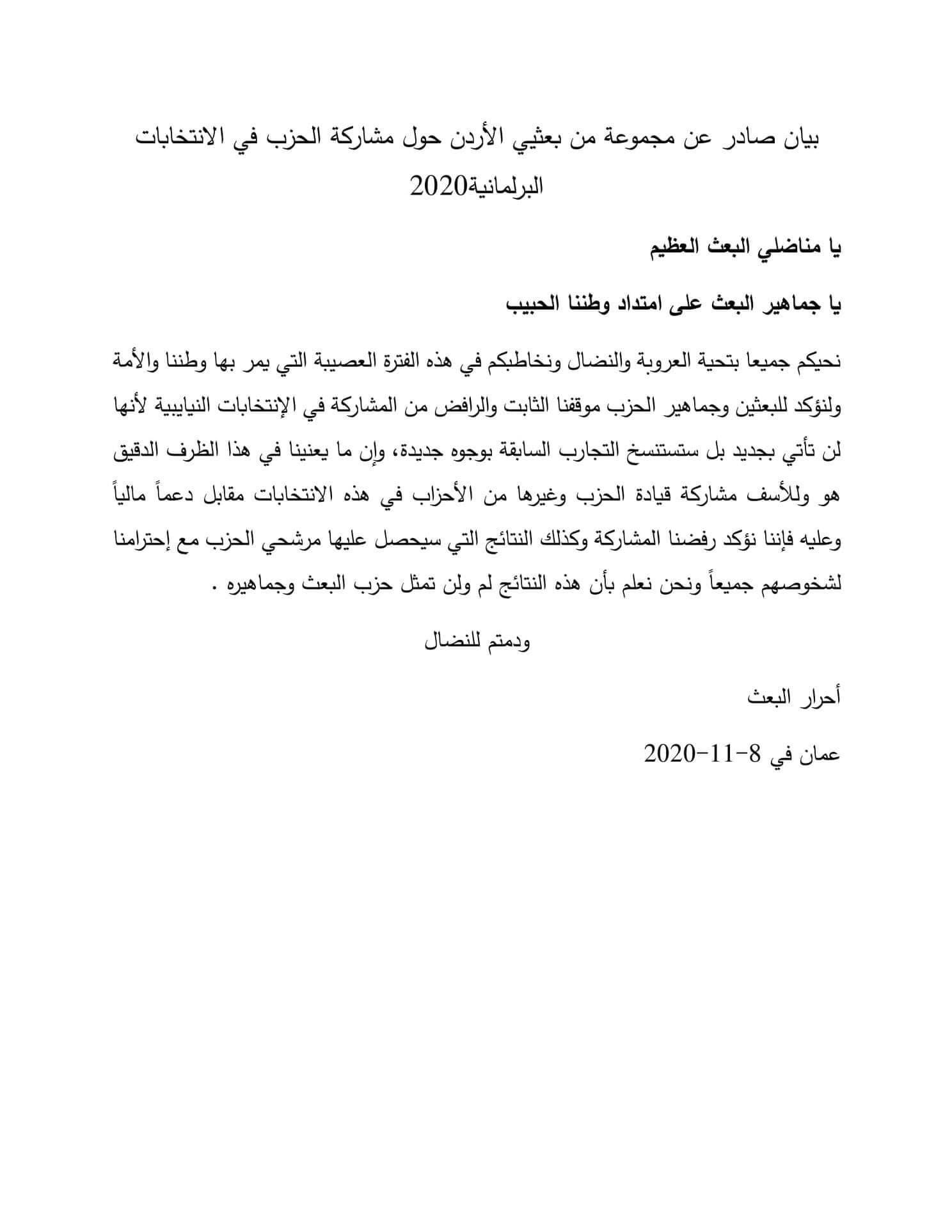 أصدرت مجموعة من كوادر وأعضاء حزب البعث العربي الاشتراكي في الأردن بيانًا أدانت فيه مشاركة قيادة حزب البعث في الانتخابات النيابية ٢٠٢٠ مؤكدة في بيانها أن ما سيحصل عليه مرشحو الحزب في هذه الانتخابات لا يمثل دور الحزب ومكانته السياسية والاجتماعية وحمل البيان توقيع أحرار البعث .. ويأتي إصدار هذا البيان قبل يومين فقط من الانتخابات البرلمانية التي ستجري في الاردن في العاشر من الشهر الجاري .. وفي ما يلي نص البيان الذي تم تداوله على صفحات مواقع التواصل الاجتماعي
