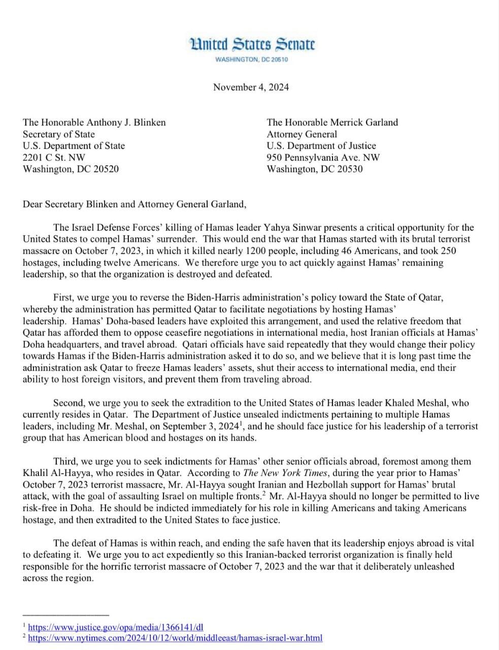 وقالت الرسالة، "نعتقد أنه قد حان الوقت منذ فترة طويلة لأن تطلب الإدارة الأمريكية من قطر تجميد أصول قادة حماس وإغلاق وصولهم إلى وسائل الإعلام الدولية وإنهاء قدرتهم على استضافة الزوار الأجانب ومنعهم من السفر إلى الخارج. ثانيًا، نحثكم على السعي لتسليم القيادي في حماس خالد مشعل، المقيم حاليًا في قطر، إلى الولايات المتحدة.. ثالثًا، نحثكم على السعي لتقديم لوائح اتهام ضد كبار مسؤولي حماس الآخرين في الخارج، وفي مقدمتهم خليل الحية المقيم في قطر.وينبغي توجيه الاتهام إليه فورًا لدوره في قتل أمريكيين واحتجاز أمريكيين رهائن،
