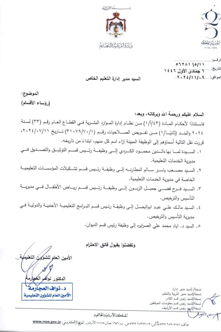 . السيد فرح فضي جميل الزبون إلى وظيفة رئيس قسم رياض الأطفال في مديرية التأسيس والترخيص. السيد مالك علي عبد ابوالبصل إلى وظيفة رئيس قسم البرامج التعليمية الأجنبية والدولية في مديرية التأسيس والترخيص. . السيد د. اياد محمد علي الصرايره إلى وظيفة رئيس قسم الديوان.