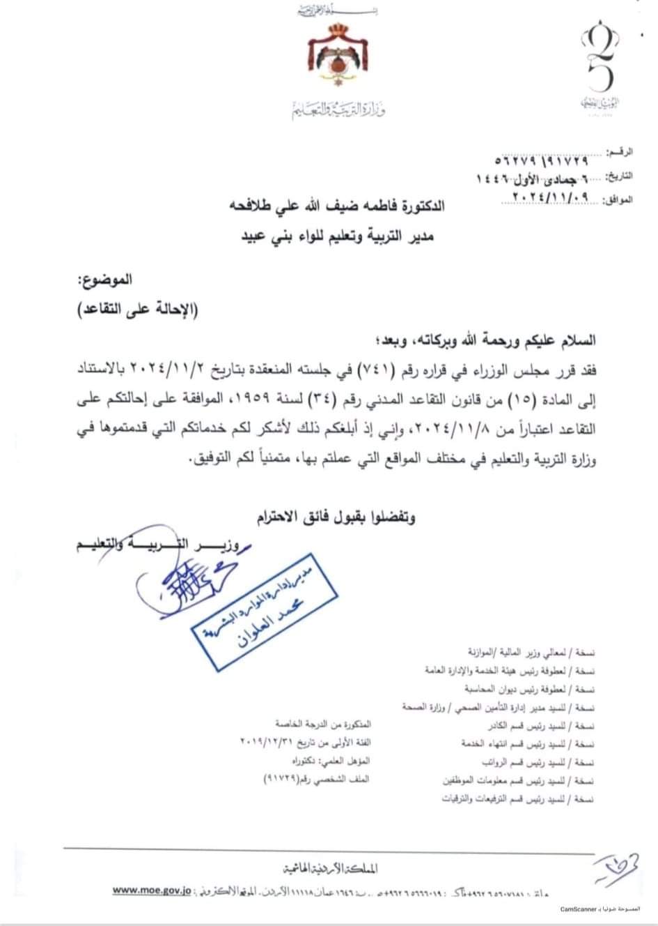 قرر الامين العام للشؤون التعليمية الدكتور نواف العجارمة، نقل التالية أسماؤهم إلى الوظيفة المبينة إزاء اسم كل منهم، ابتداء من تاريخه، وذلك استنادًا لأحكام المادة (١/١/٤٣) من نظام إدارة الموارد البشرية في القطاع العام رقم (۳۳) لسنة ٢٠٢٤ والبند (ثانيا (١) من تفويض الصلاحيات رقم (۳۱۰۷۹/۷۰/۱) تاريخ ٢٠٢٤/٠٧/١١. كما قرر مجلس الوزراء في قراره رقم (٧٤١) في جلسته المنعقدة بتاريخ ٢٠٢٤/١١/٢ بالاستناد إلى المادة (١٥) من قانون التقاعد المدني رقم (٣٤) لسنة ١٩٥٩ ، الموافقة على إحالة الدكتورة فاطمه ضيف الله علي طلافحه مدير التربية وتعليم للواء بني عبيد على التقاعد اعتباراً من ۲۰۲٤/۱۱/۸ . وتاليا اسماء التشكيلات بالتربية: