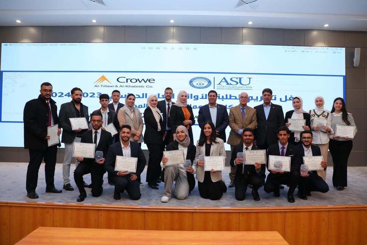اختتم حفل تكريم الطلبة الأوائل في قسم المحاسبة بكلية الأعمال في جامعة العلوم التطبيقية الخاصة للعام الأكاديمي 2023-2024 بنجاح كبير، حيث تم تنظيمه برعاية شركة Crowe (التلاوي والخطيب-مدققون معتمدون)، التي تُعتبر من الشركات الرائدة في مجال التدقيق والاستشارات المالية والمحاسبية وتساهم بفاعلية في دعم المشاريع التعليمية والمبادرات المجتمعية. شهد الحفل حضوراً مميزاً من أعضاء الهيئة التدريسية والطلبة، حيث تم توزيع الجوائز والشهادات على الطلبة المتميزين من قبل ممثلي الشركة الراعية، تقديراً لجهودهم ونجاحاتهم العلمية.