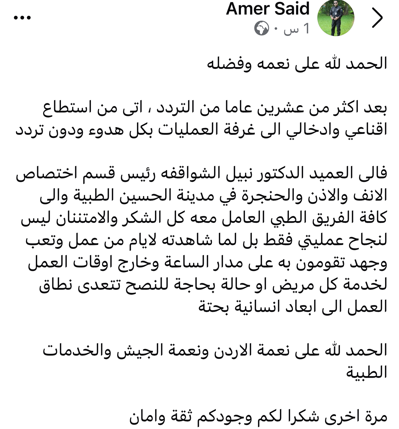 وقال السرطاوي في ادراج له عبر صفحته الشخصية على موقع فيسبوك ، " بعد اكثر من عشرين عاما من التردد ، اتى من استطاع اقناعي وإدخالي الى غرفة العمليات بكل هدوء ودون تردد، فالى العميد الدكتور نبيل الشواقفه رئيس قسم اختصاص الأنف والأذن والحنجرة في مدينة الحسين الطبية والى كافة الفريق الطبي العامل معه كل الشكر والامتنان ليس لنجاح عمليتي فقط بل لما شاهدته لأيام من عمل وتعب وجهد تقومون به على مدار الساعة وخارج أوقات العمل لخدمة كل مريض او حالة بحاجة للنصح تتعدى نطاق العمل الى ابعاد انسانية بحتة، الحمد لله على نعمة الاردن ونعمة الجيش والخدمات الطبية ، مرة اخرى شكرا لكم وجودكم ثقة وامان" .
