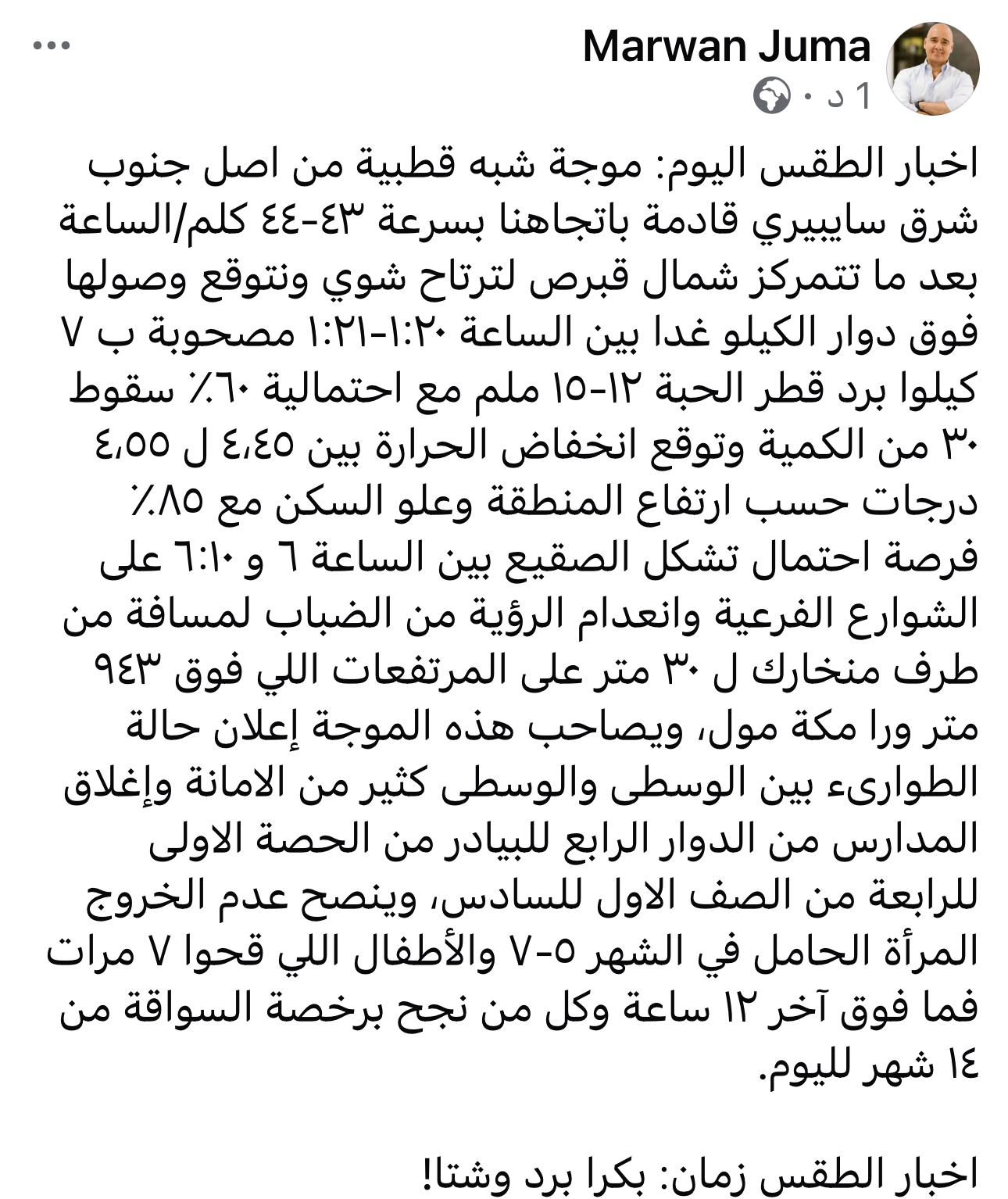 موجة شبه قطبية من اصل جنوب شرق سايبيري قادمة باتجاهنا بسرعة ٤٣-٤٤ كلم/الساعة بعد ما تتمركز شمال قبرص لترتاح شوي ونتوقع وصولها فوق دوار الكيلو غدا بين الساعة ١:٢٠-١:٢١ مصحوبة ب ٧ كيلوا برد قطر الحبة ١٢-١٥ ملم مع احتمالية ٦٠٪ سقوط ٣٠ من الكمية وتوقع انخفاض الحرارة بين ٤،٤٥ ل ٤،٥٥ درجات حسب ارتفاع المنطقة وعلو السكن مع ٨٥٪ فرصة احتمال تشكل الصقيع بين الساعة ٦ و ٦:١٠ على الشوارع الفرعية وانعدام الرؤية من الضباب لمسافة من طرف منخارك ل ٣٠ متر على المرتفعات اللي فوق ٩٤٣ متر ورا مكة مول، ويصاحب هذه الموجة إعلان حالة الطوارىء بين الوسطى والوسطى كثير من الامانة وإغلاق المدارس من الدوار الرابع للبيادر من الحصة الاولى للرابعة من الصف الاول للسادس، وينصح عدم الخروج المرأة الحامل في الشهر ٥-٧ والأطفال اللي قحوا ٧ مرات فما فوق آخر ١٢ ساعة وكل من نجح برخصة السواقة من ١٤ شهر لليوم.