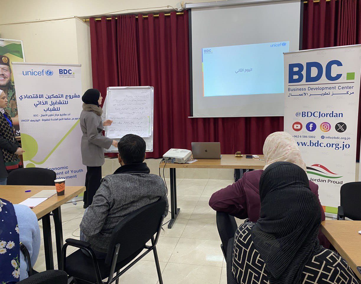 تم البدء ببرنامج تدريبي مكثف من خلال مركز تطوير الاعمال BDC لمجموعة من الشباب بهدف بناء قدراتهم في مجال ريادة الأعمال والادارة المالية والابتكار، وجاءت هذه التدريبات بهدف بناء قدرات الشباب المشاركين إلى جانب تنمية مهاراتهم في مجال التمكين الاقتصادي والوصول الى فرص التشغيل الذاتي؛ بغية تأسيس المشاريع الريادية الصغيرة الخاصة بهم، حيث تم تنفيذ هذه الورشه ضمن مشروع "التمكين الاقتصادي لخلق فرص التشغيل الذاتي" أحد برامج مركز تطوير الأعمال BDC المدعوم من منظمة اليونيسف.