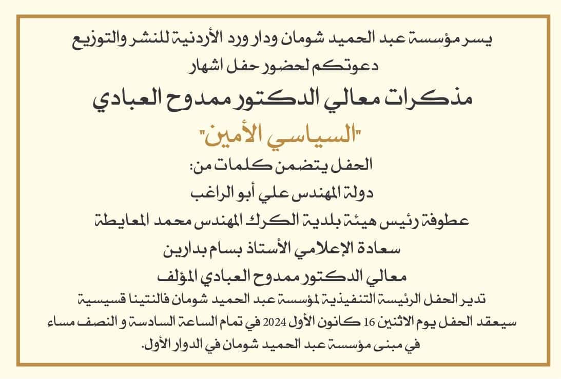 أعلنت مؤسسة عبد الحميد شومان، بالتعاون مع دار ورد الأردنية للنشر والتوزيع، عن تنظيم حفل إشهار مذكرات الدكتور ممدوح العبادي، التي تحمل عنوان “السياسي الأمين”، وذلك يوم الاثنين الموافق 16 كانون الأول 2024 في تمام الساعة السادسة والنصف مساءً في مبنى المؤسسة الكائن في الدوار الأول. ويتضمن الحفل كلمات لكل من: المهندس علي أبو الراغب. رئيس بلدية الكرك المهندس محمد المعايطة. الإعلامي الأستاذ بسام بدارين. الدكتور ممدوح العبادي، مؤلف الكتاب. وسيتم إدارة الحفل من قبل السيدة فالنتينا قسيسية، الرئيسة التنفيذية لمؤسسة عبد الحميد شومان