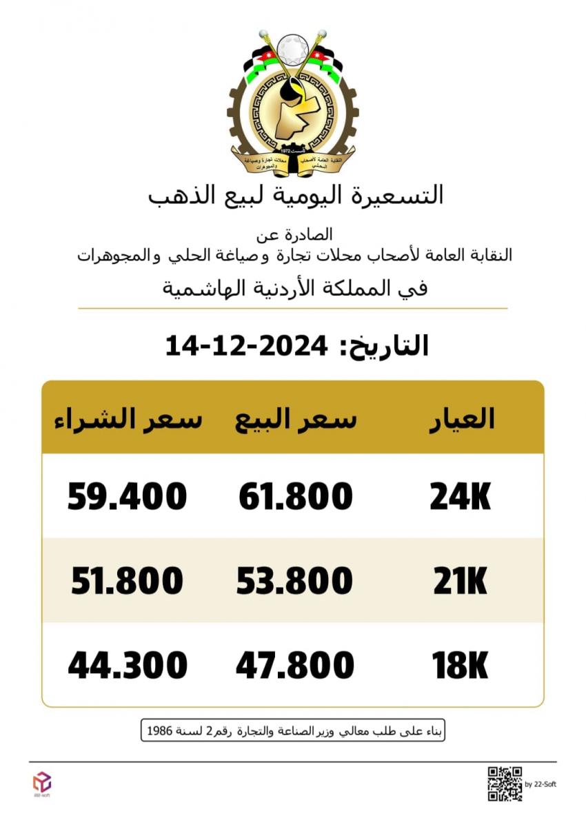 انخفض سعر بيع غرام الذهب عيار 21 محليا، اليوم السبت، 70 قرشا، ليصل إلى 53.80 دينارا لغايات البيع من محالّ الصاغة، مقابل 51.80 دينارا لجهة الشراء. وبحسب التسعيرة اليومية الصادرة عن النقابة العامة لأصحاب محال تجارة الحلي والمجوهرات، انخفض أيضا سعر بيع الغرام الواحد من الذهب عياري 24 و18 من محال الصاغة، ليبلغ 61.80 دينارا و 47.80 دينارا على التوالي.