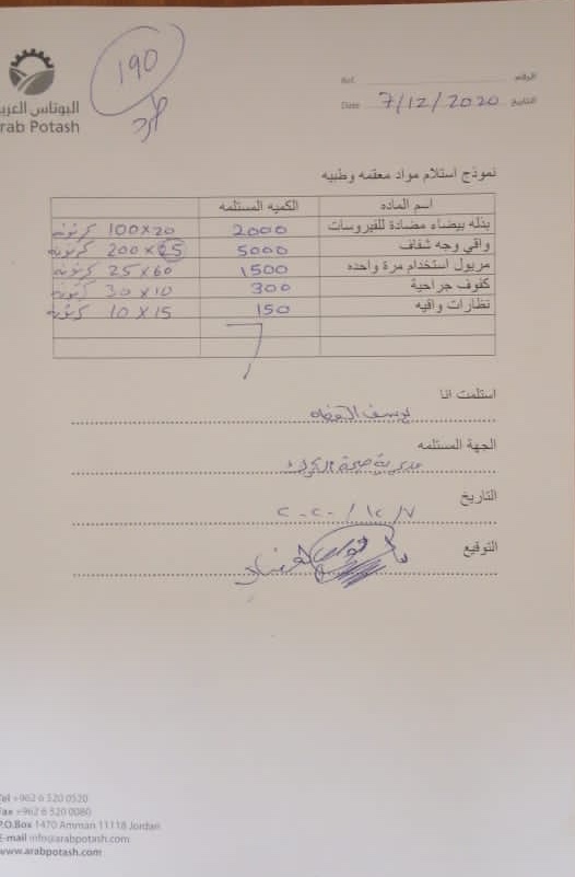 تبرعت شركة البوتاس العربية بمواد طبية وقائية لمديرية صحة محافظة الكرك لمساعدة الكوادر الطبية على ممارسة عملها بأمان خصوصا في ظل جائحة كورونا