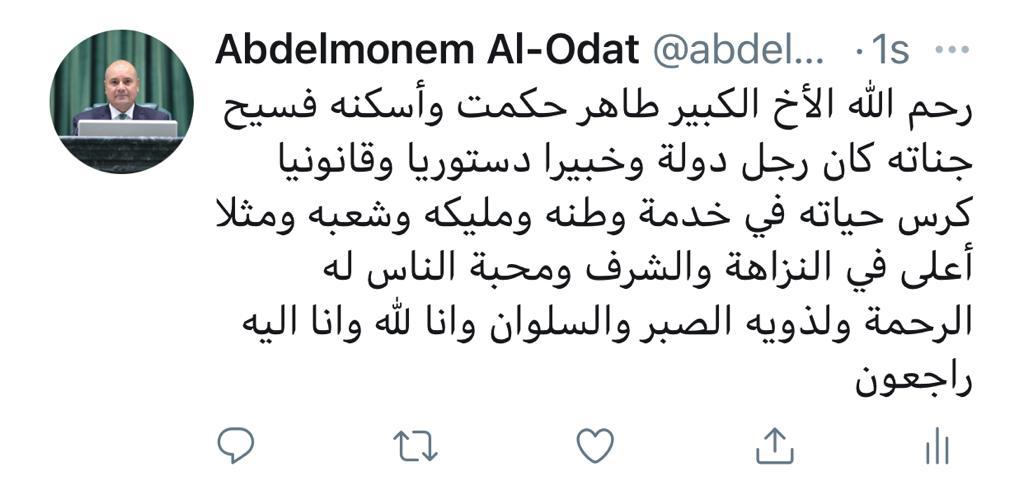 اخبار البرلمان :العودات ينعى طاهر حكمت.