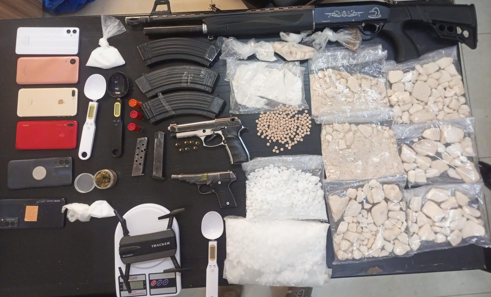 وأكّد الناطق الإعلامي أنّ أولى وأبرز تلك القضايا كانت حملة أمنيّة نفذتها قوة مشتركة ضمن مناطق البادية الوسطى على مجموعة من الأشخاص من المتورطين بقضايا الاتجار والترويج أُلقي القبض على أربعة أشخاص وضبط بحوزتهم كمّيات متفرقة من المواد المخدرة والأسلحة النارية،