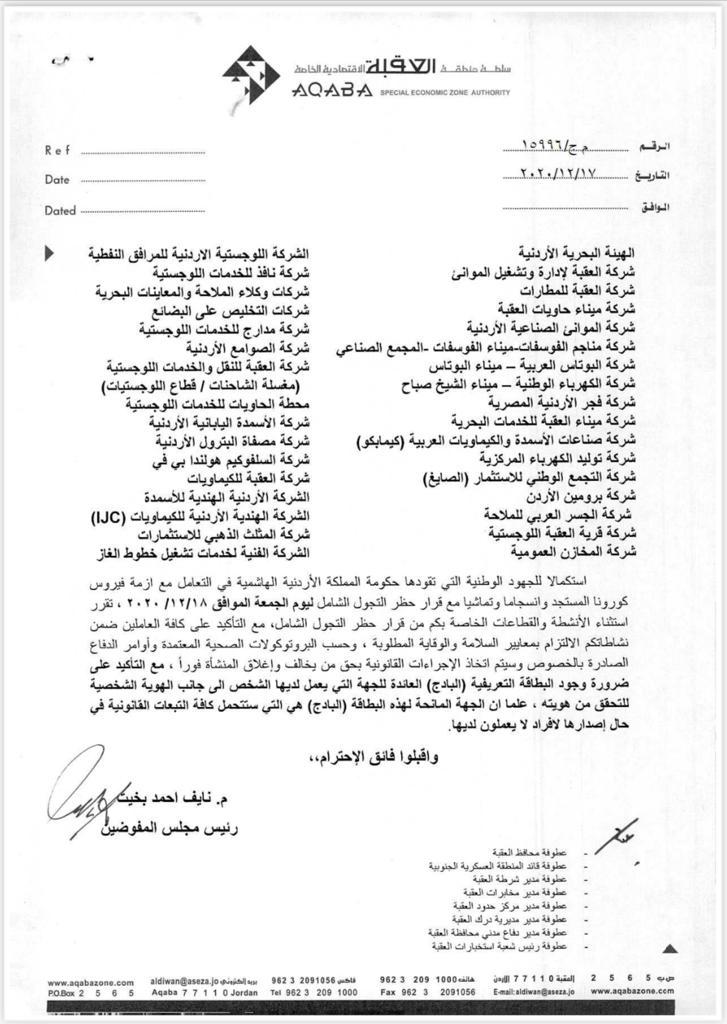 اخبار الاردن : رئيس سلطة العقبة يستثني من الحظر ٣٣ شركة و ميناء و مؤسسات بحرية من حظر الجمعة- وثيقة