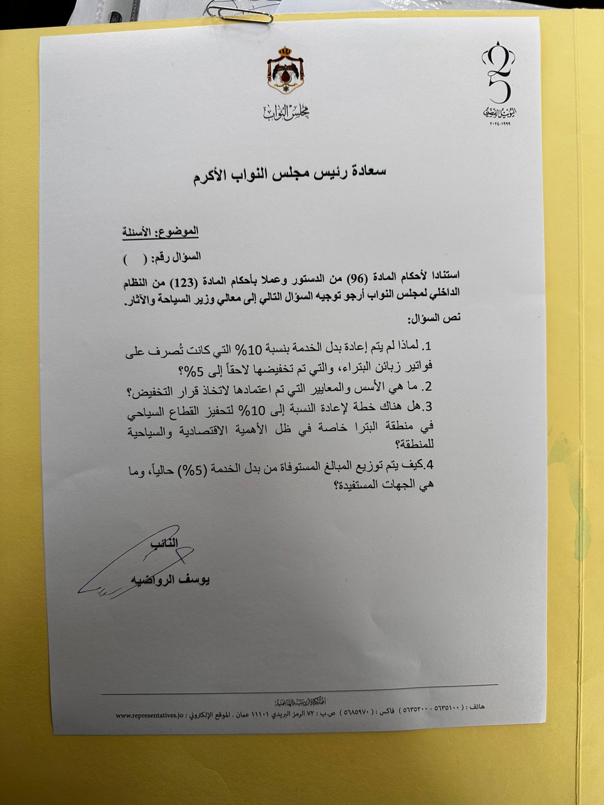 استنادا لأحكام المادة (96) من الدستور وعملا بأحكام المادة (123) من النظام الداخلي لمجلس النواب ارجو توجيه سؤالي إلى معالي وزير السياحة والآثار.