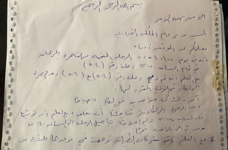 رسالة من ركاب الرحلتين 504 و506 إلى مدير عام الملكية الأردنية