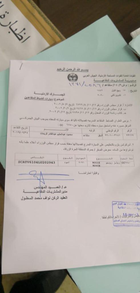 تداولت مواقع التواصل الاجتماعي خلال الليلة الماضية وباستهجان وثيقة تبين شراء رئيس هيئة الأركان الاسبق الفريق محمود الفريحات لمركبة فاخرة يقدر ثمنها بعشرات الالوف .