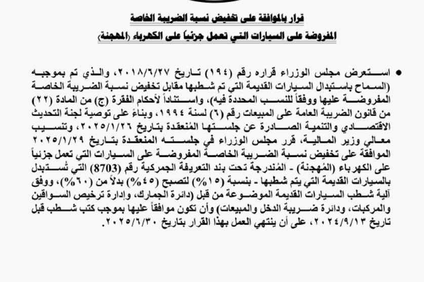 قرر مجلس الوزراء الموافقة على تخفيض نسبة الضريبة الخاصة المفروضة على المركبات التي تعمل جزئياً على الكهرباء (المهجنة)، والتي تستبدل بالسيارات القديمة التي يتم شطبها، بنسبة 15 % لتصبح 45 % بدلا من 60 %، وفقاً لآلية الشطب التنظيمية الموضوعة من قبل (دائرة الجمارك، وإدارة ترخيص السواقين والمركبات، ودائرة ضريبة الدخل والمبيعات)، وأن تكون موافقة وفقاً لما يجب عند شطبها قبل تاريخ 13/9/2024، على أن ينتهي العمل بهذا القرار بتاريخ 30/6/2025.