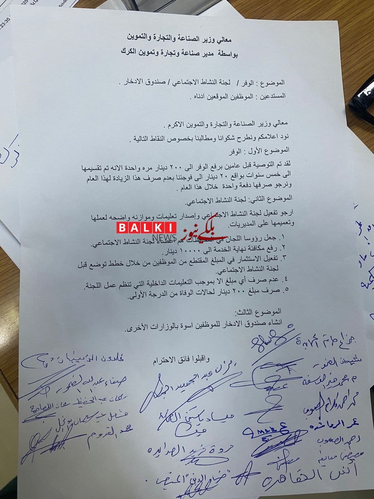 وصل بريد بلكي نيوز وثيقة موقعة من عدد من موظفي مديرية صناعة وتجارة الكرك جاء فيها :-