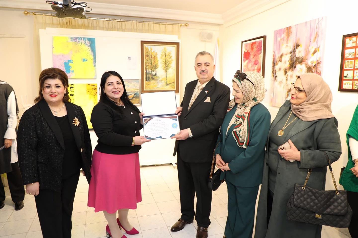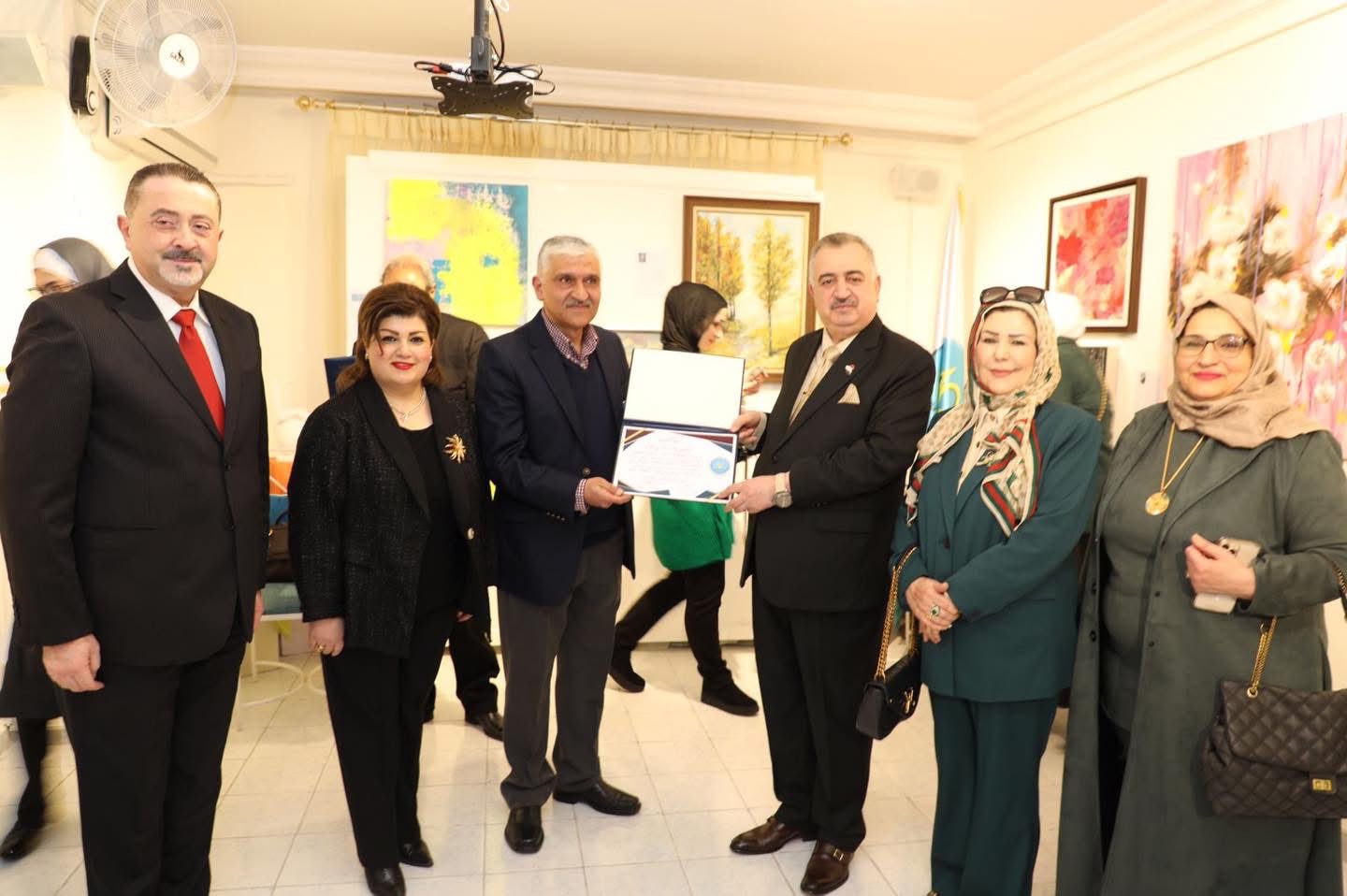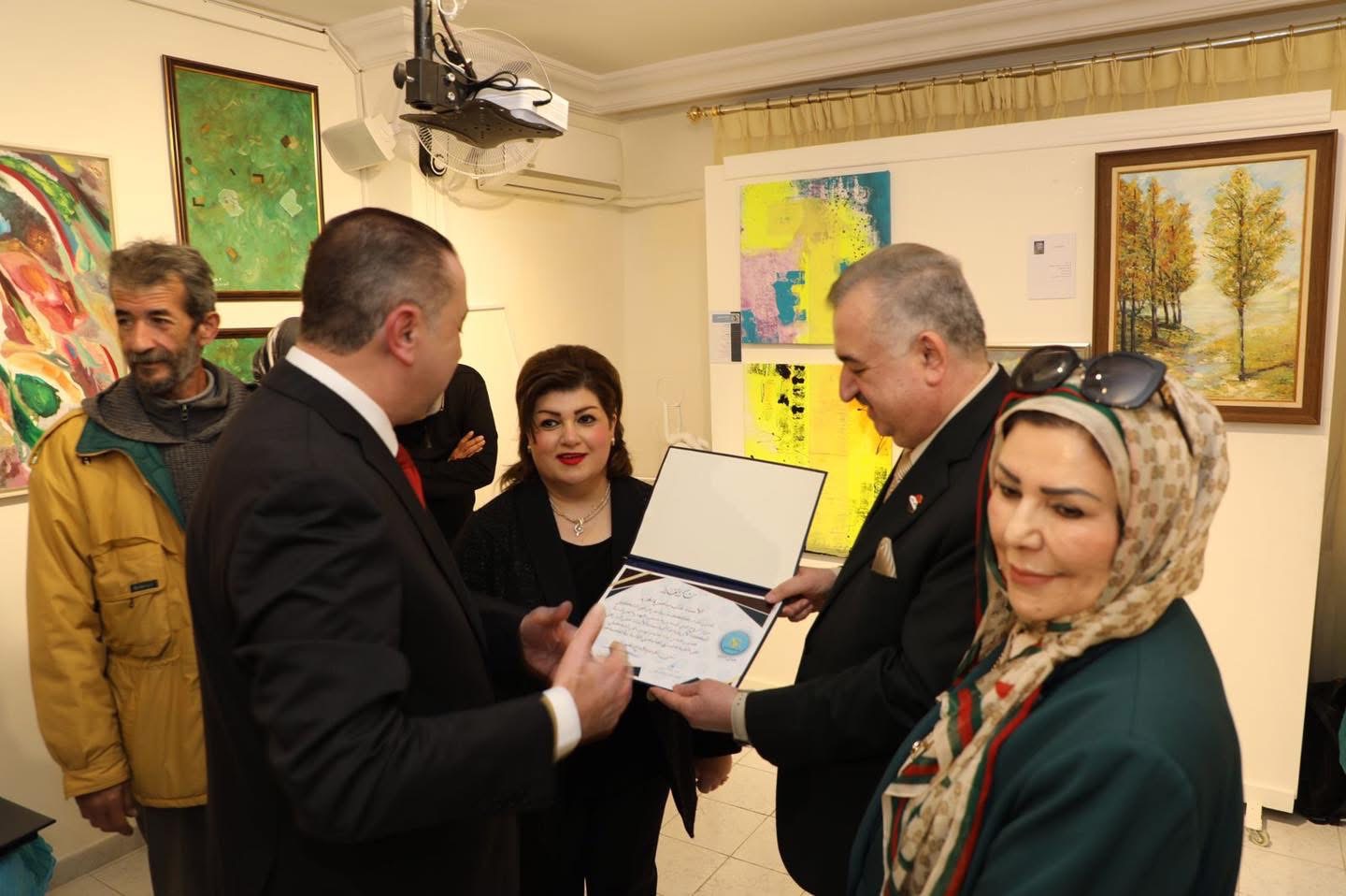 وفي ختام الأمسية، قدم السفير البرزنجي شهادات تهنئة تقديرية للفنانين المشاركين في المعرض.