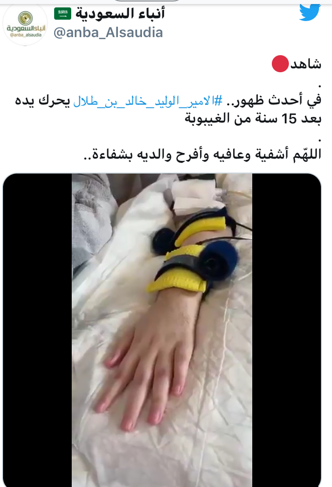 ويظهر فى مقطع الفيديو، التي نشرته صفحة "أنباء السعودية" على "تويتر"، "الأمير الوليد وهو يقوم برفع أصابعه إلى أعلى استجابة لتوجيهات الطبيب"، وذلك بعد غيبوبة دامت 15 عاما، ولم يظهر الفيديو الذى تم تداوله أى تاريخ لوقت التقاطه.