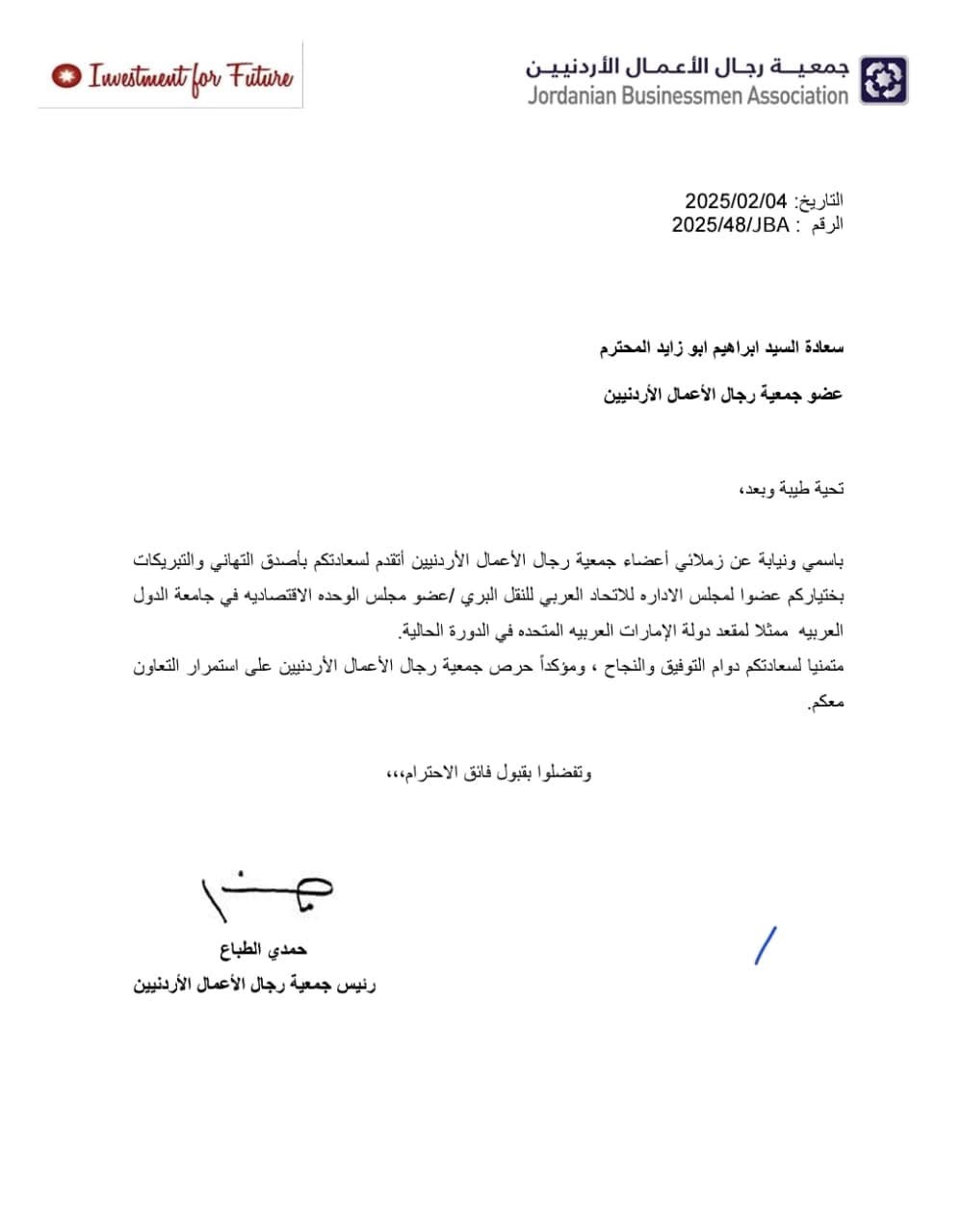 إختير رجل الأعمال الأردني البارز إبراهيم أبو زايد (أبو اليسار) لعضوية مجلس إدارة الاتحاد العربي للنقل البري، وعضوية الوحدة الاقتصادية في جامعة الدول العربية، بالإضافة إلى تمثيله لدولة الإمارات العربية المتحدة في الدورة الحالية.
