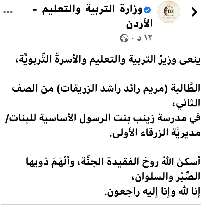 نعى وزيرُ التربية والتعليم تيسير النعيمي والأسرةُ التَّربويَّة، الطَّالبة (مريم رائد راشد الزريقات) من الصف الثاني، في مدرسة زينب بنت الرسول الأساسية للبنات/ مديريَّة الزرقاء الأولى.