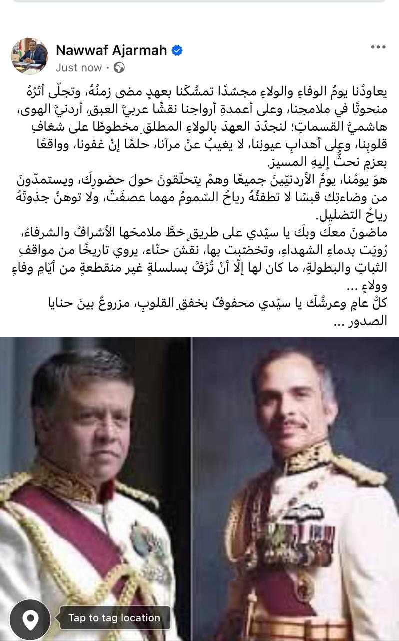 يعاودُنا يومُ الوفاءِ والولاءِ مجسّدًا تمسُّكَنا بعهدٍ مضى زمنُهُ، وتجلّى أثرُهُ منحوتًا في ملامحِنا، وعلى أعمدةِ أرواحِنا نقشًا عربيَّ العبقِ، أردنيَّ الهوى، هاشميَّ القسماتِ؛ لنجدّدَ العهدَ بالولاءِ المطلقِ مخطوطًا على شغافِ قلوبِنا، وعلى أهدابِ عيونِنا، لا يغيبُ عنْ مرآنا، حلمًا إنْ غفونا، وواقعًا بعزمٍ نحثُّ إليهِ المسيرَ.