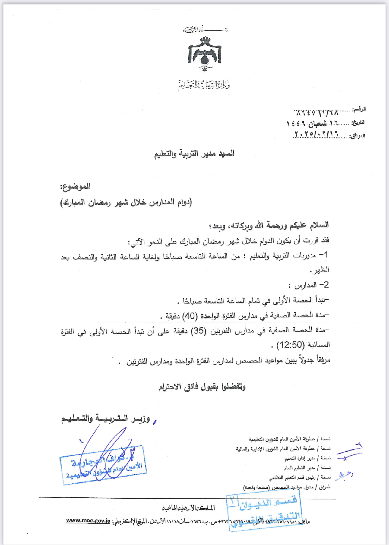 عمان، الأردن - أعلنت وزارة التربية والتعليم عن تعديل أوقات الدوام المدرسي خلال شهر رمضان المبارك لعام 1446 هـ، الموافق 2025 ميلادية.