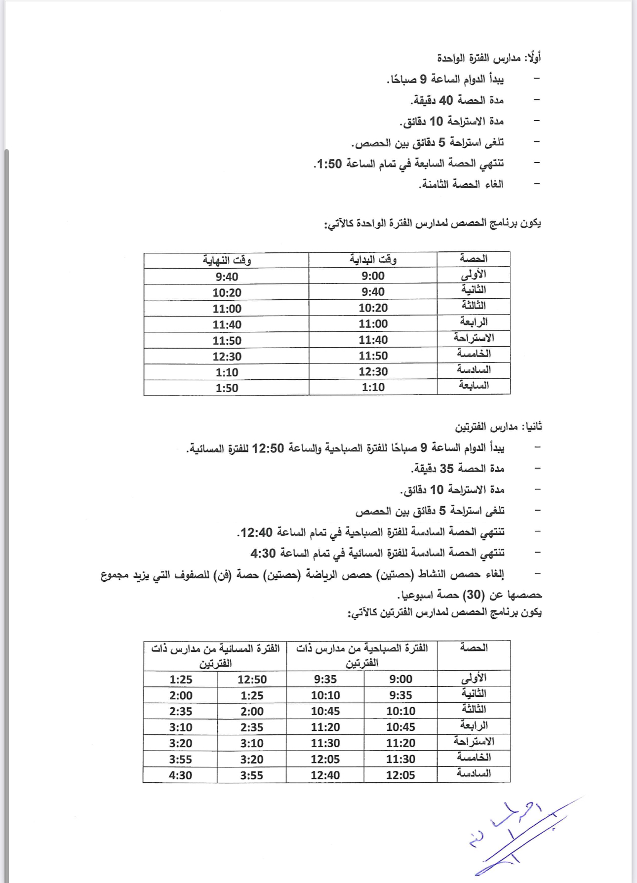 وقد تقرر أن يبدأ دوام المدارس في تمام الساعة التاسعة صباحًا، مع تقليل مدة الحصص الدراسية.