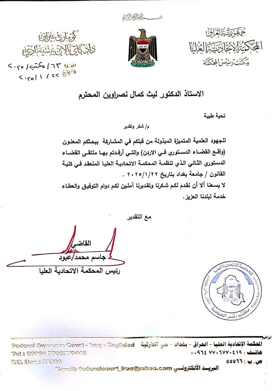 المحكمة الاتحادية العليا في العراق تشكر الدكتور ليث نصراوين لمشاركته المتميزة في ملتقى القضاء الدستوري