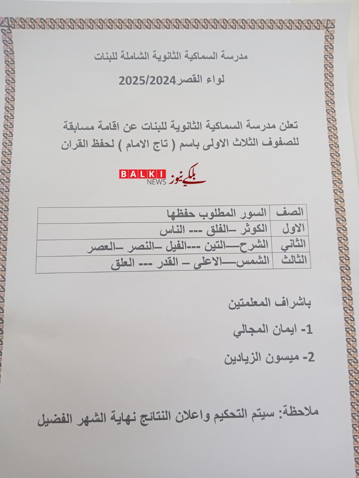 الكرك - مدرسة السماكية الثانوية الشاملة للبنات تطلق مسابقة "تاج الإمام" لحفظ القرآن الكريم
