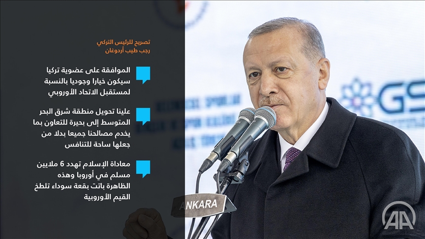 الرئيس التركي خلال استقباله سفراء دول الاتحاد الأوروبي لدى أنقرة: ـ من الممكن تحويل 2021 إلى عام النجاحات في العلاقات التركية الأوروبية ـ الموافقة على عضوية تركيا ستكون خيارا وجوديا بالنسبة إلى مستقبل الاتحاد الأوروبي