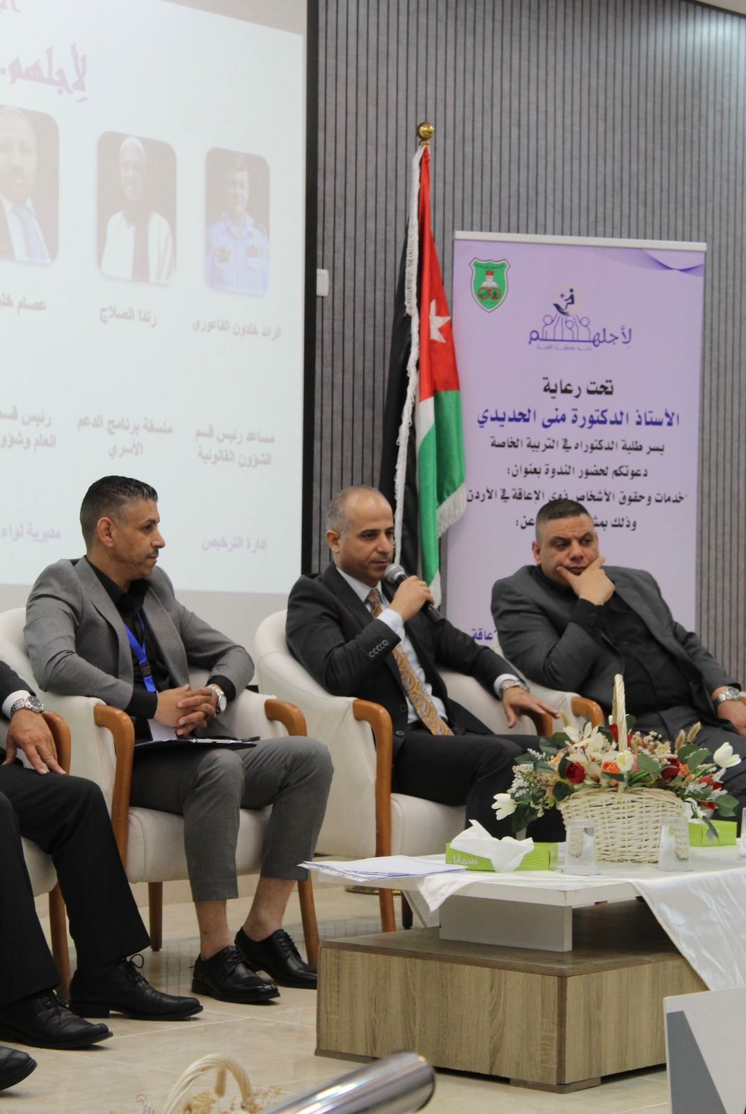 وبمشاركة نخبة من المتحدثين ، أ. "يزن الخليل" رئيس قسم التعليم العالي- المجلس الأعلى لحقوق الأشخاص ذوي الإعاقة، الدكتور "محمد الرحامنه" مدير برامج الطلبة ذوي الإعاقة- وزارة التربية والتعليم، الدكتور "محمود القلعاوي" رئيس قسم الإعاقات، مديرية صحة ذوي الإعاقة والصحة النفسية- وزارة الصحة، أ. "عصام خليفات" رئيس قسم التعليم العام وشؤون الطلبة- مديرية لواء القويسمة، الأستاذه "رندا الصلاج" منسقة برنامج الدعم الأسري- جمعية سنا ، الرائد "خلدون الفاعوري" مساعد رئيس قسم الشؤون القانونية- إدارة الترخيص.
