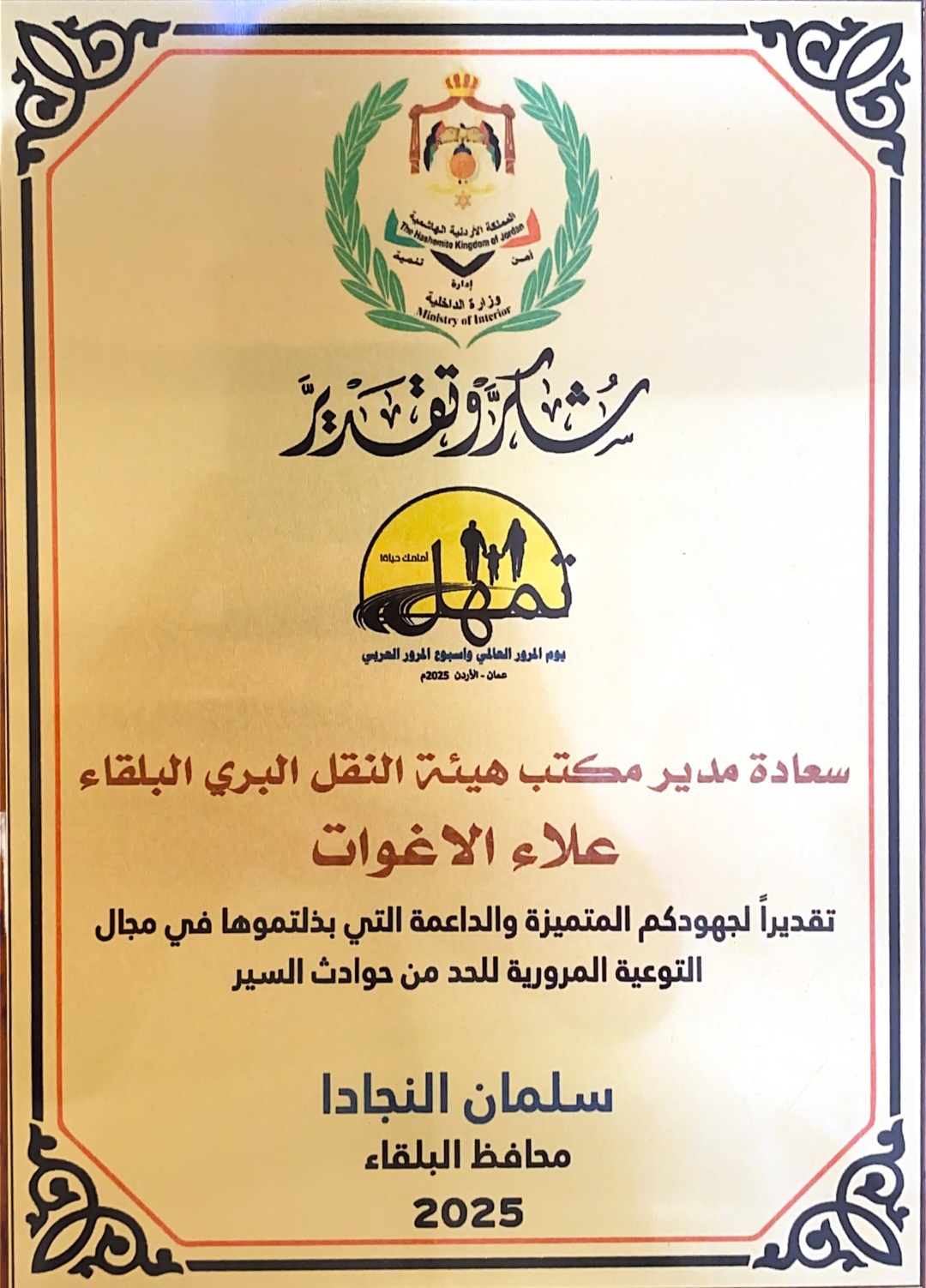 كرم محافظ البلقاء سلمان نجادا مدير هيئة تنظيم النقل البري البلقاء "علاء الاغوات" ضمن حفل بيوم المرور العالمي وأسبوع المرور العربي / الأردن 2025 والذي عقد تحت شعار (تمهل أمامك حياة)، وذلك تقديراً لدور الهيئة ممثله بمديرها العام في حملات التوعية المرورية للحد من حوادث السير ومشاركتها الفاعلة في نشر ثقافة السلامة المرورية.