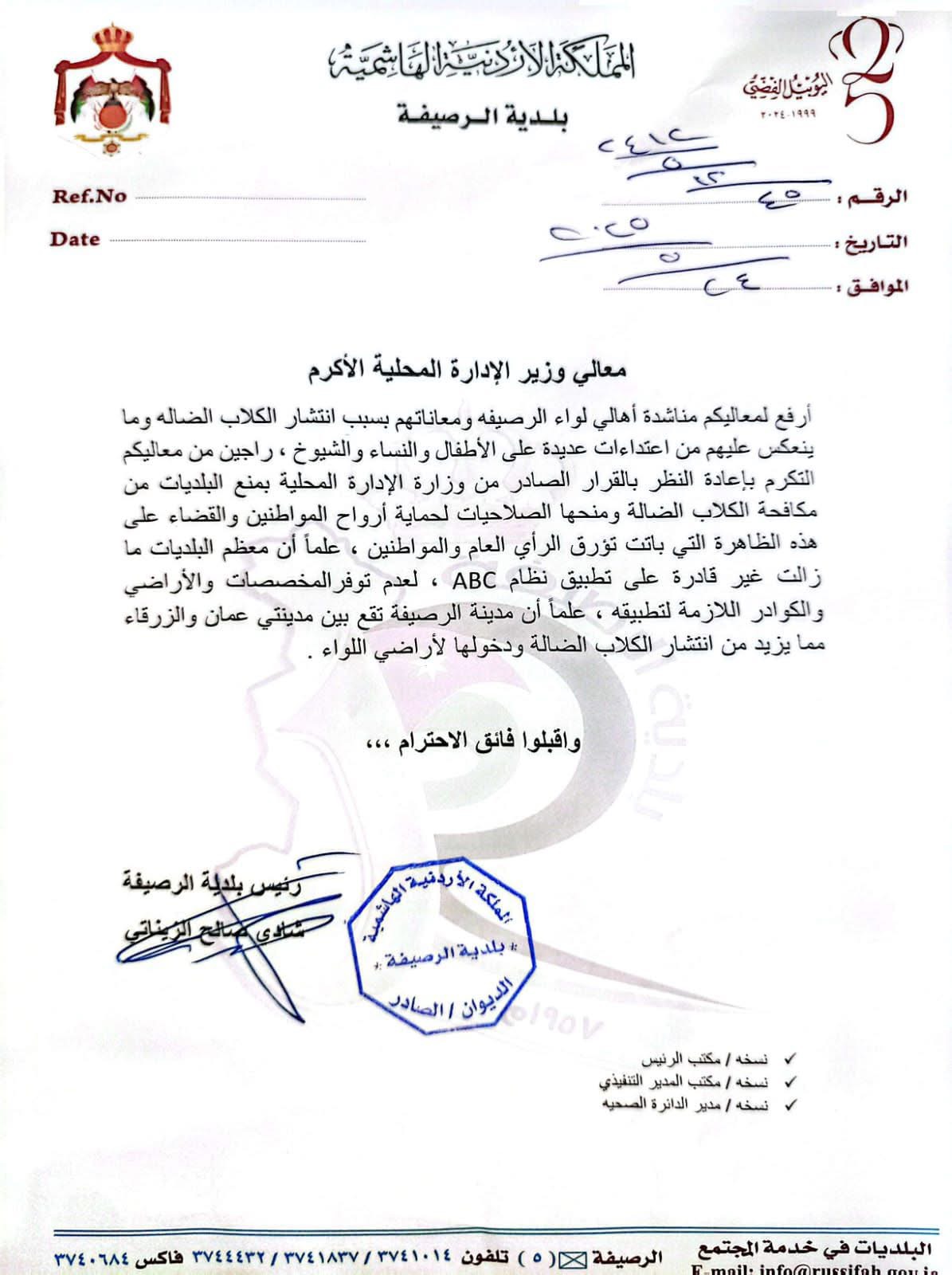 جاءت مناشدة الزيناتي، بحسب الوثيقة التي حصل عليها موقع بلكي نيوز في ضوء تزايد شكاوى أهالي لواء الرصيفة ومعاناتهم المستمرة من انتشار الكلاب الضالة وما يترتب عليه من اعتداءات متكررة على الأطفال والنساء والشيوخ.