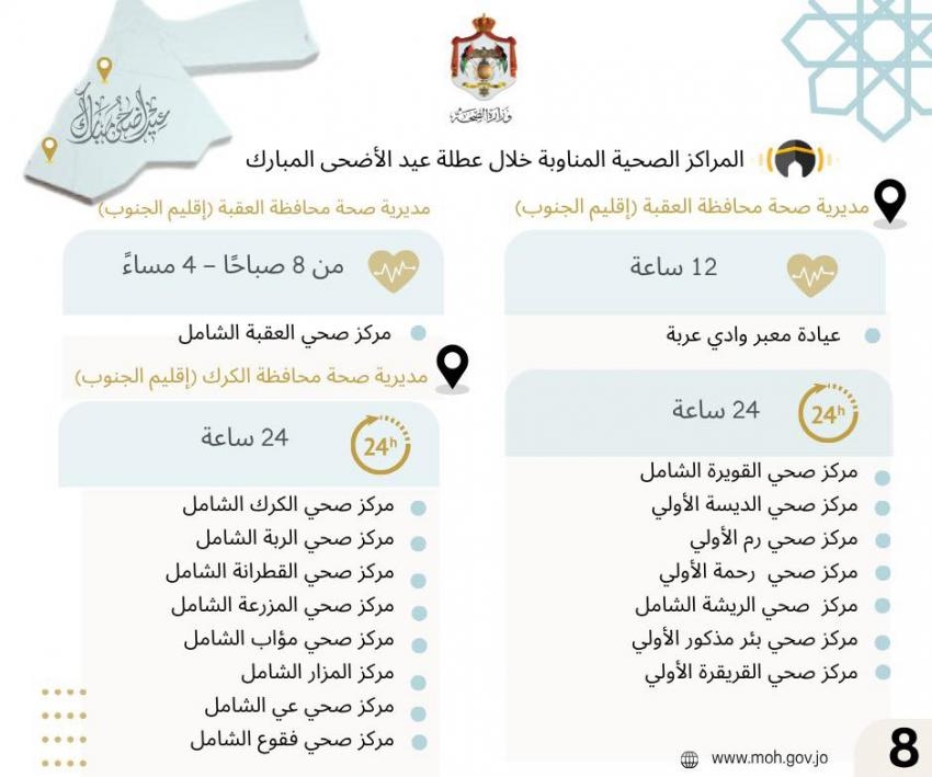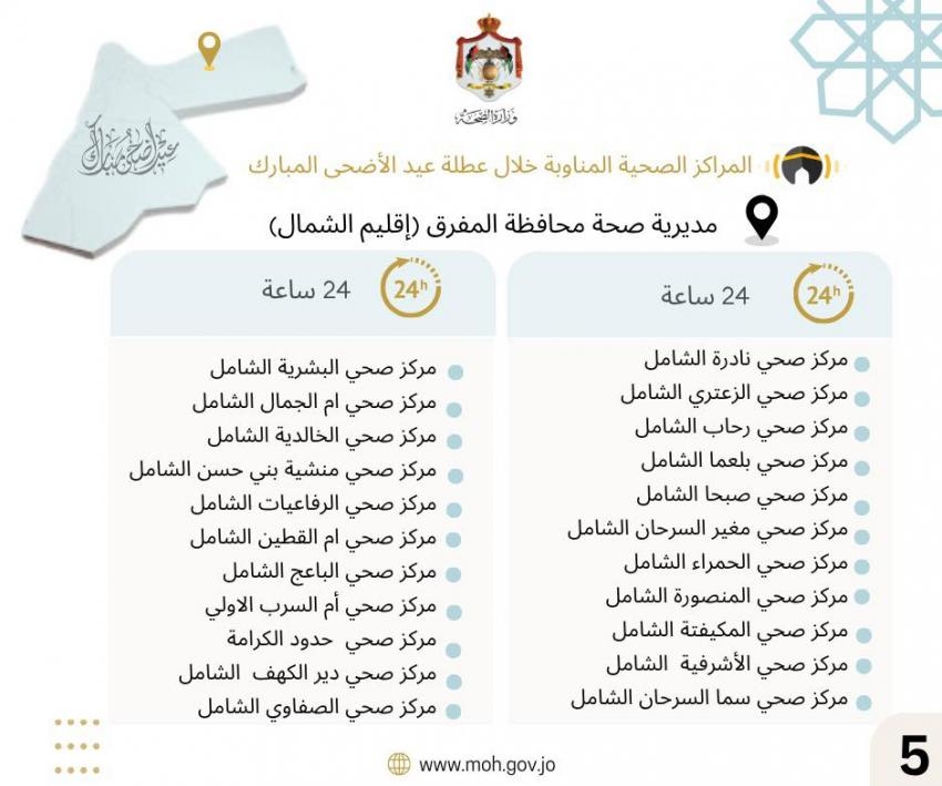 أعلنت وزارة الصحة اليوم الاربعاء، أسماء المراكز الصحية المناوبة خلال عطلة عيد الأضحى المبارك في الفترة الواقعة ما بين (5-2025/6/10)، في جميع محافظات المملكة.