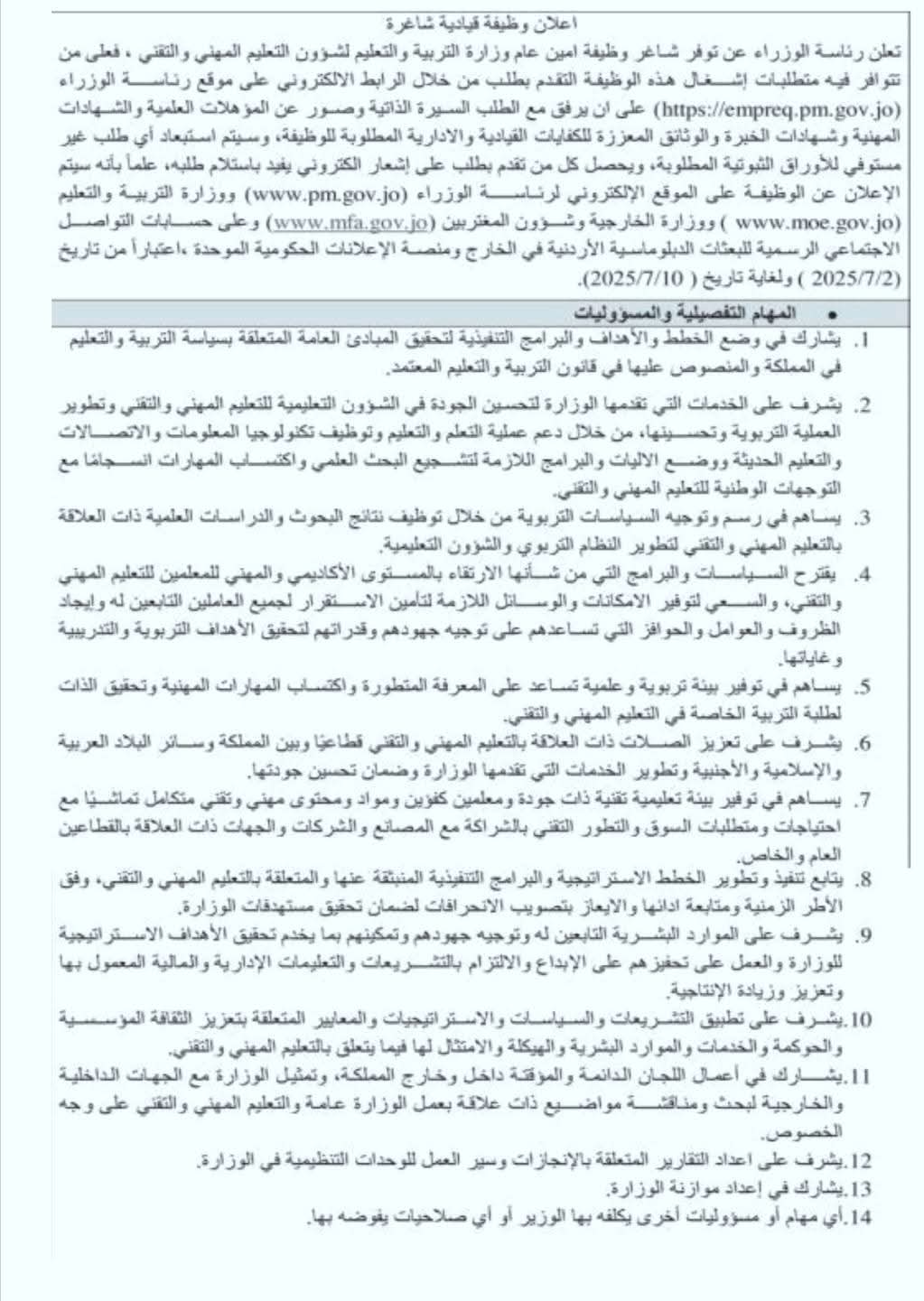 تعلن رئاسة الوزراء عن توفر شاغر وظيفة أمين عام وزارة التربية والتعليم لشؤون التعليم المهني والتقني، فعلى من تتوافر فيه متطلبات إشغال هذه الوظيفة التقدم بطلب من خلال الرابط الالكتروني على موقع رئاسة الوزراء (https://empreq.pm.gov.jo) على ان يرفق مع الطلب السيرة الذاتية وصور عن المؤهلات العلمية والشهادات المهنية وشهادات الخبرة والوثائق المعززة للكفايات القيادية والادارية المطلوبة للوظيفة، وسيتم استبعاد أي طلب غير مستوفي للأوراق الثبوتية المطلوبة، ويحصل كل من تقدم بطلب على إشعار الكتروني يفيد باستلام طلبه، علماً بأنه سيتم الإعلان عن الوظيفة على الموقع الإلكتروني لرئاسة الوزراء (www.pm.gov.jo) ووزارة الخارجية لشؤون المغتربين وعلى حسابات التواصل الاجتماعي الرسمية للبعثات الدبلوماسية الاردنية في الخارج ومنصة الاعلانات الحكومية الموحدة,اعتباراً من تاريخ (2025/7/2 ) ولغاية تاريخ ( 2025/7/10
