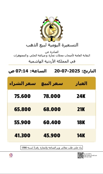 أعلنت النقابة العامة لأصحاب محلات تجارة وصياغة الحلي والمجوهرات، اليوم الأحد، عن التسعيرة الرسمية لأسعار الذهب في السوق المحلية.
