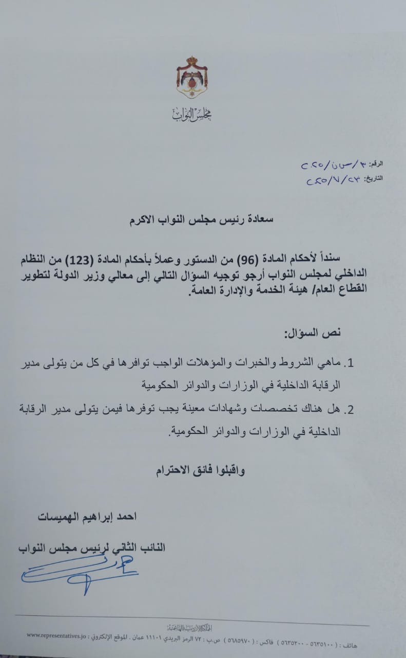 وجّه النائب أحمد إبراهيم الهميسات، النائب الثاني لرئيس مجلس النواب، سؤالًا نيابيًا إلى وزير الدولة لتطوير القطاع العام/رئيس هيئة الخدمة والإدارة العامة، استنادًا إلى المادة (96) من الدستور وعملاً بأحكام المادة (123) من النظام الداخلي لمجلس النواب.