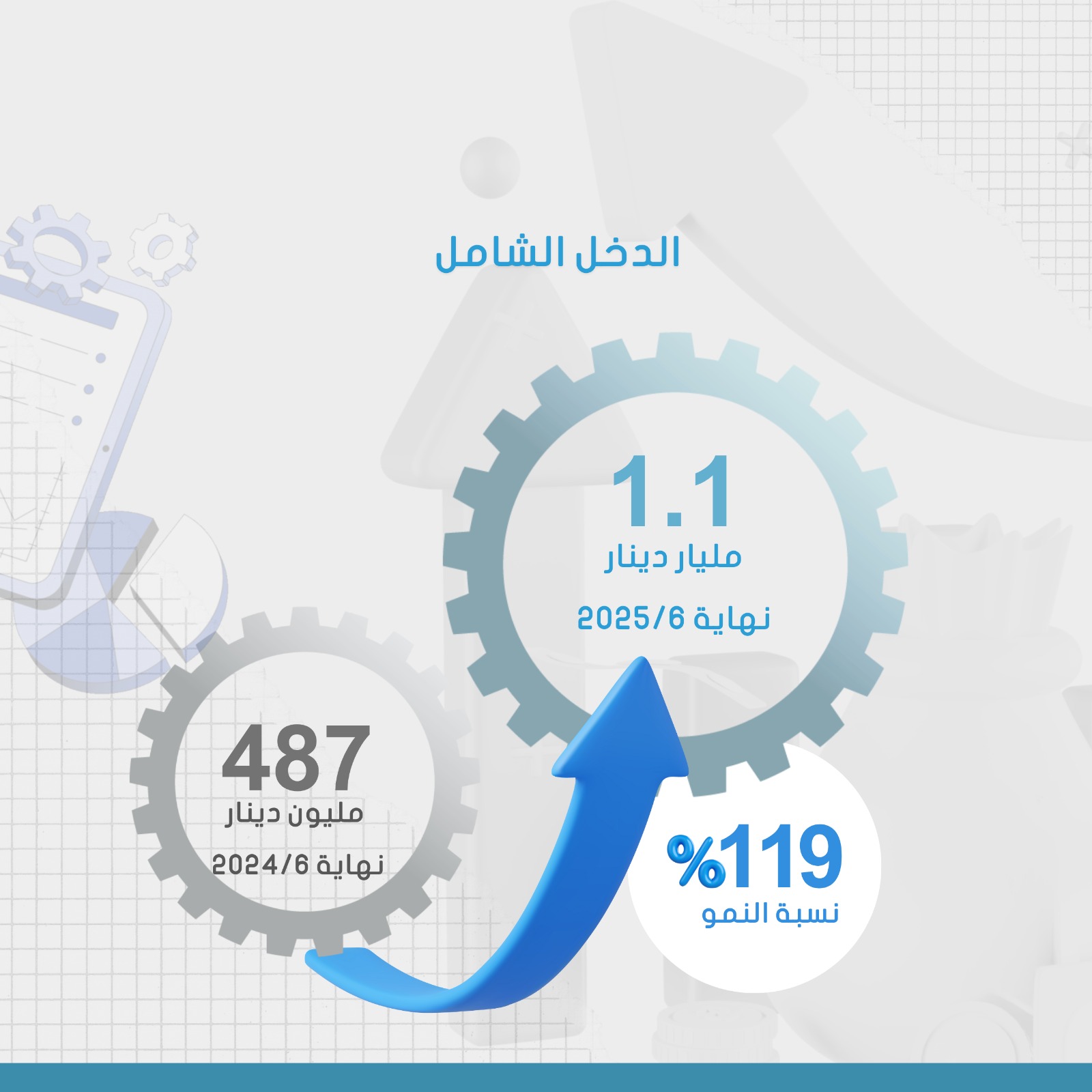 119% نسبة نمو الدخل الشامل ليصل الى 1.1 مليار دينار منها حوالي 591 تمثل صافي الدخل من المحافظ الاستثمارية