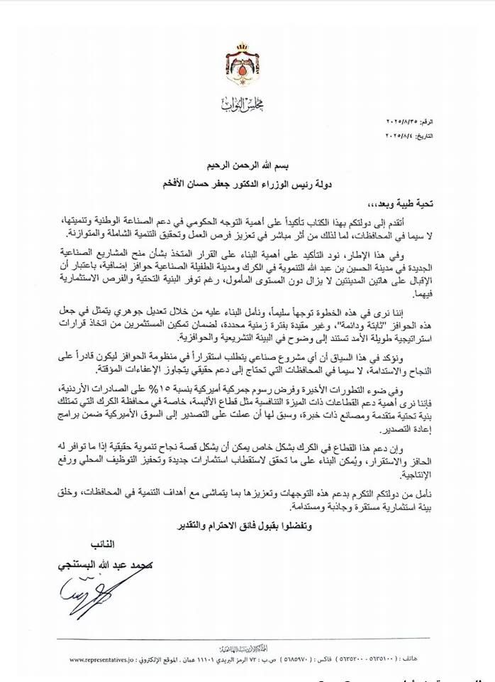 البستنجي يطالب رئيس الوزراء بدعم الصناعات الوطنية في الكرك والأغوار