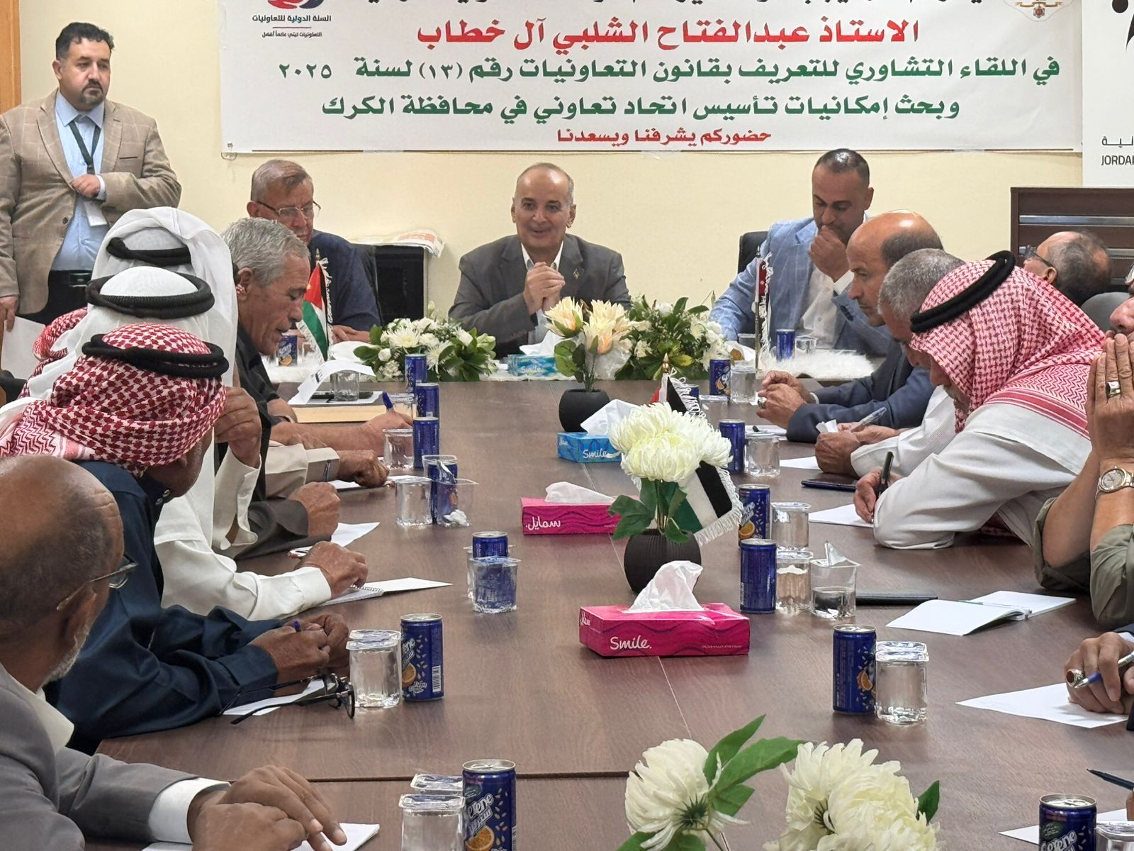 وقال الشلبي خلال لقاء تشاوري مع عدد من رؤساء لجان إدارة التعاونيات في محافظة الكرك، بحضور مدير التعاون محمد العضايلة، إن المؤسسة تسعى من خلال القانون الجديد إلى تعزيز منظومة العمل التعاوني بين أبناء المجتمع كافة، وخاصة بين فئتي الشباب والنساء؛ باعتبار التعاونيات أحد أهم أدوات التنمية المحلية التي تساهم في تحسين الوضع الاقتصادي والاجتماعي للأفراد، وتوفير فرص عملٍ من خلال مشاريعها الإنتاجية.