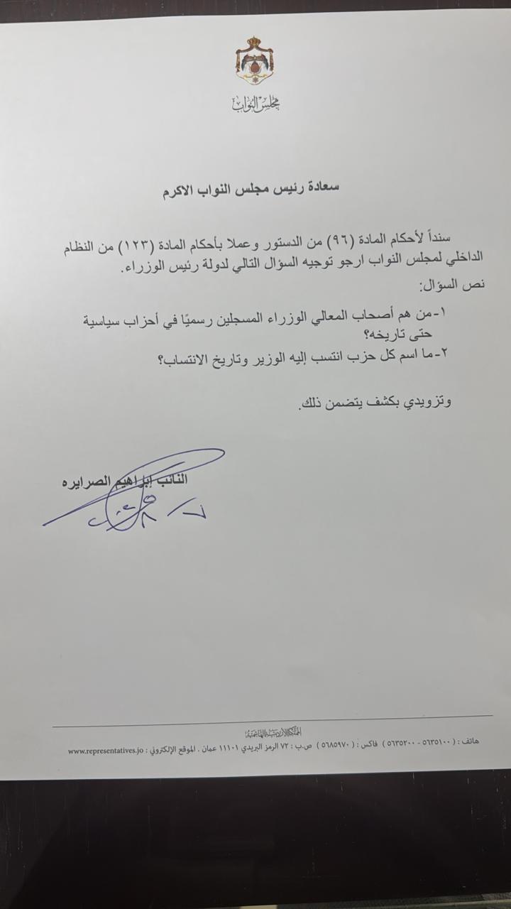 وجه النائب إبراهيم الصرايرة سؤالًا نيابيًا موجهًا إلى دولة رئيس الوزراء، استنادًا لأحكام المادة (96) من الدستور والمادة (123) من النظام الداخلي لمجلس النواب.
