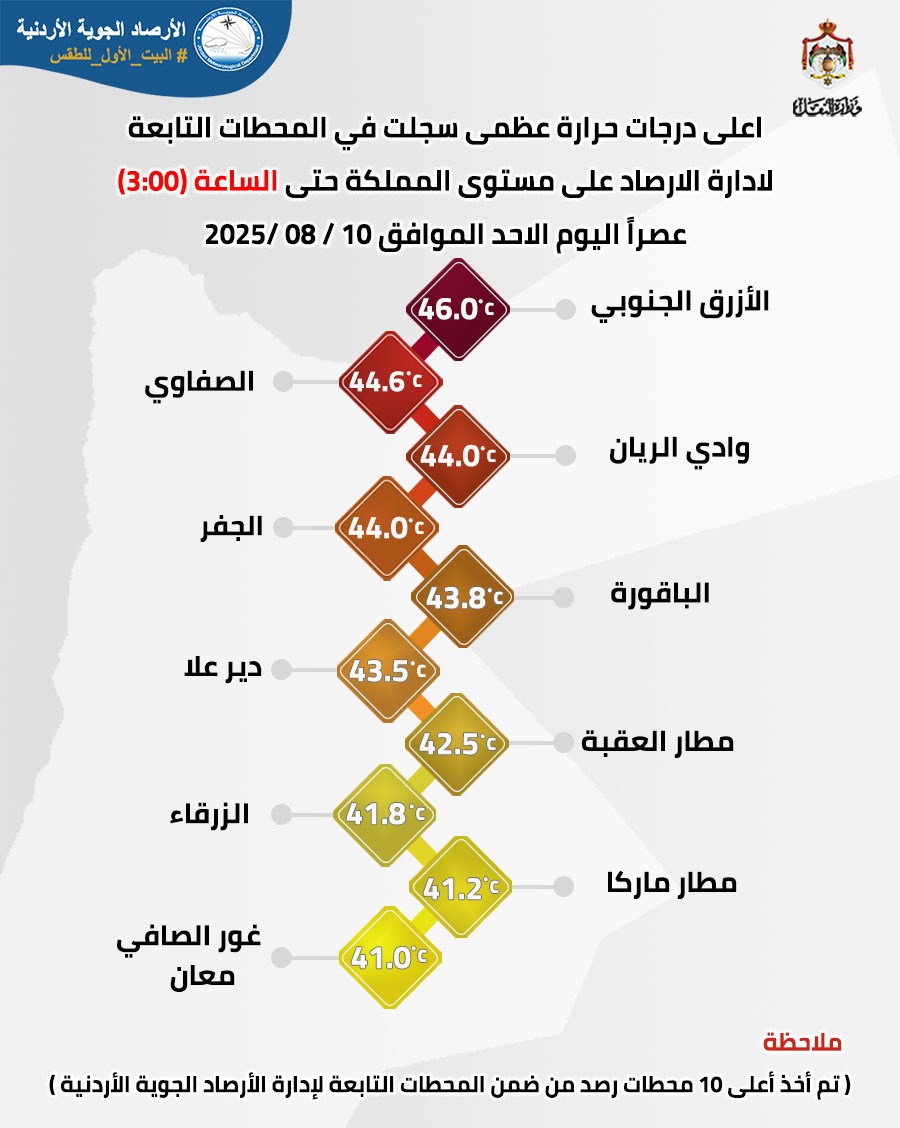 وسجلت منطقتي وادي الريان والجفر الأحد 44 درجة مئوية، تلتها الباقورة بتسجيلها 43.8 درجة مئوية، ثم دير علا بتسجيلها 43.5 درجة مئوية.