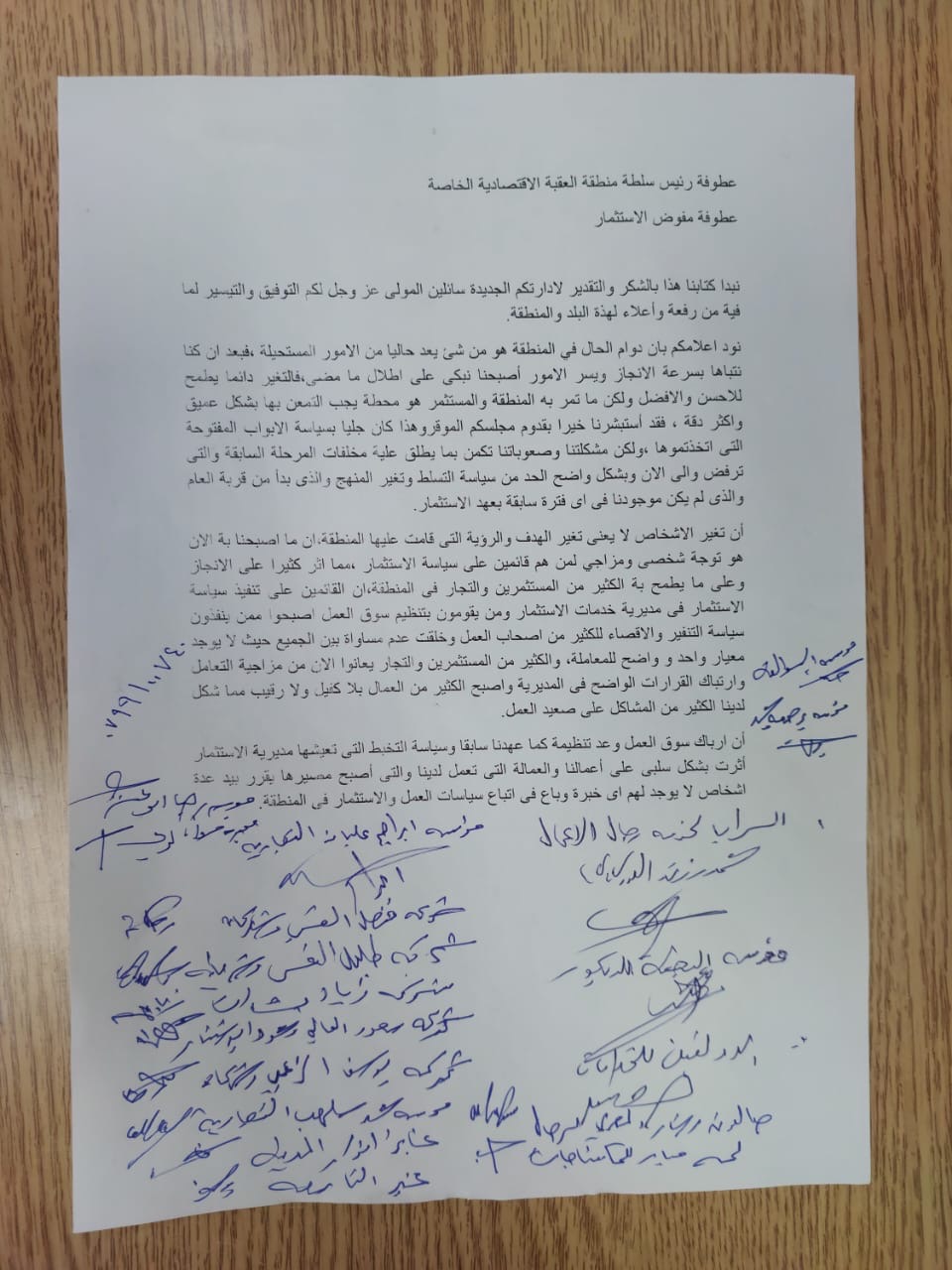 وتأتي هذه الشكوى في سياق يطالب فيه المستثمرون ببيئة عمل مستقرة ومنظمة بعيداً عن القرارات الفردية، لضمان استمرار تدفق الاستثمارات في المنطقة الحيوية.