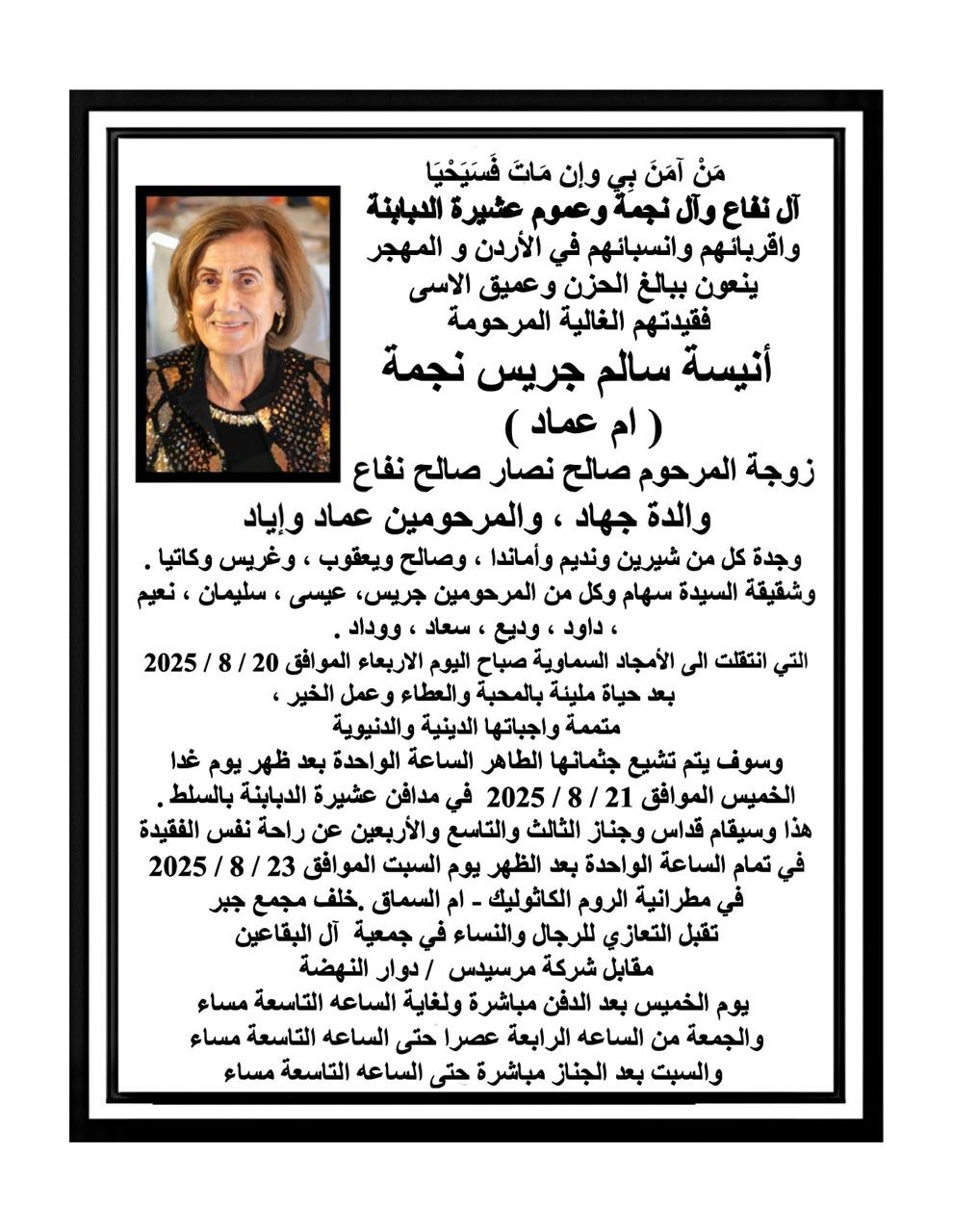 بمزيد من الحزن والأسى، انتقلت إلى رحمة الله تعالى فقيدة آل نفاع وآل نجمة، السيدة الفاضلة أنيسة سالم جريّس نجمة (أم عماد)، أرملة المرحوم نصار صالح نفاع.