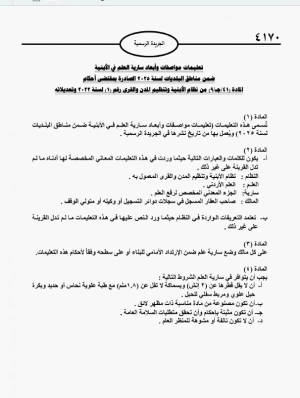 عمّان - صدر في الجريدة الرسمية الأردنية قرار جديد يُلزم جميع مالكي العقارات في المملكة بتركيب سارية علم إما في واجهة المبنى أو على سطحه. ويسري هذا القرار اعتبارًا من تاريخ نشره.