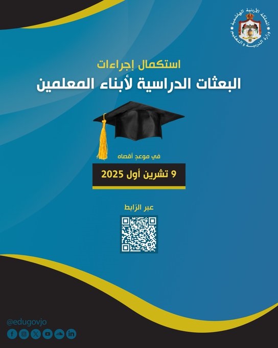 ونشرت الوزارة رابطا لاستكمال إجراءات الإيفاد في موعد أقصاه نهاية دوام الخميس 9 تشرين أول 2025 عبر الرابط التالي: