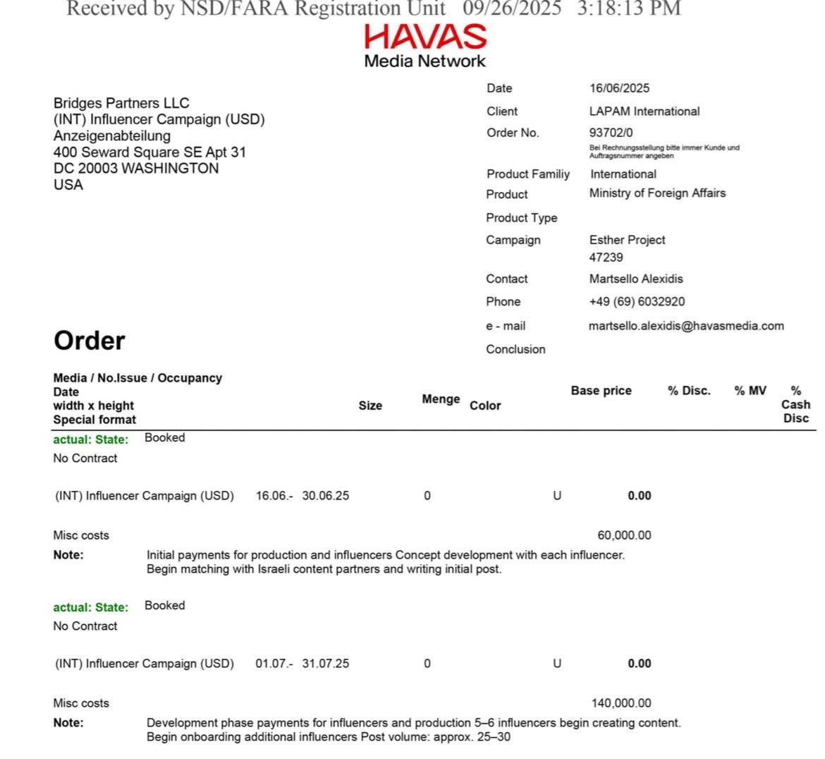 واشنطن - كشفت وثائق مسربة حديثاً عبر "ويكيليكس" ضمن ملفات قانون تسجيل الوكلاء الأجانب (FARA) عن تفاصيل حملة نفوذ "إسرائيلية" واسعة وسرية تستهدف الرأي العام الأمريكي من خلال منصات التواصل الاجتماعي. وتُظهر الوثائق أن شركة "بريدجز بارتنرز" المحدودة، التي تعمل لصالح وزارة الخارجية "الإسرائيلية"، قد وزعت أكثر من 900 ألف دولار أمريكي لتمويل وتدريب مؤثرين أمريكيين.