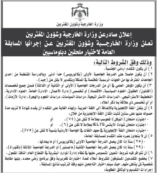 أعلنت وزارة الخارجية وشؤون المغتربين اليوم الأحد عن إجراء المسابقة العامة لاختيار ملحقين دبلوماسيين، وذلك ضمن خططها لتعزيز الكادر الدبلوماسي ورفده بكفاءات جديدة قادرة على تمثيل الأردن في الخارج بكفاءة واقتدار.