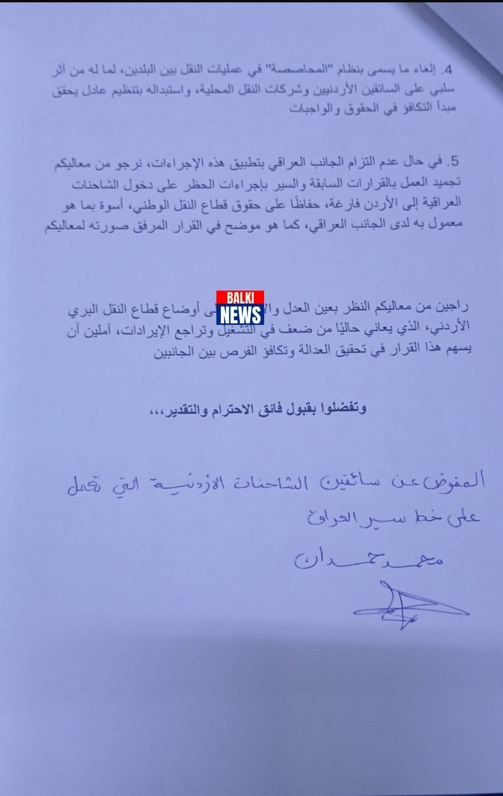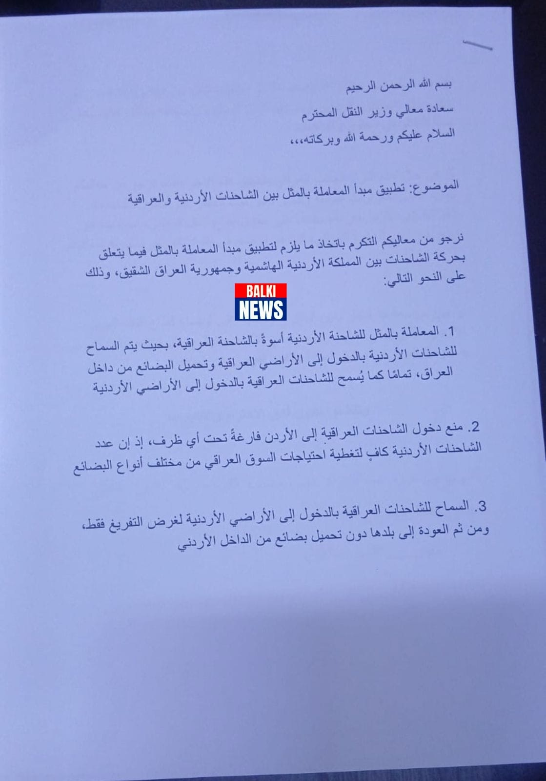 ويطالب الممثلون بإلغاء هذا النظام غير المنصف واستبداله بآلية تضمن المعاملة بالمثل الكاملة، بحيث يتم السماح للشاحنة الأردنية بالدخول إلى الأراضي العراقية لتحميل أو تفريغ البضائع، أسوةً بما يُسمح به للشاحنات العراقية في الأراضي الأردنية.