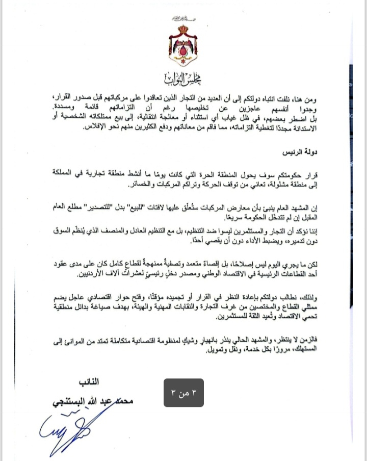 وقال النائب البستنجي، بحسب المذكرة، إن القرار فُرض دون دراسة واقعية كافية، فشهادات المطابقة المطلوبة غير متوفرة في ويستحيل إصدارها، مضيفًا أن القرار "سيغلق فعليًا أبواب المنطقة الحرة أمام حركة المركبات والنشاط التجاري.